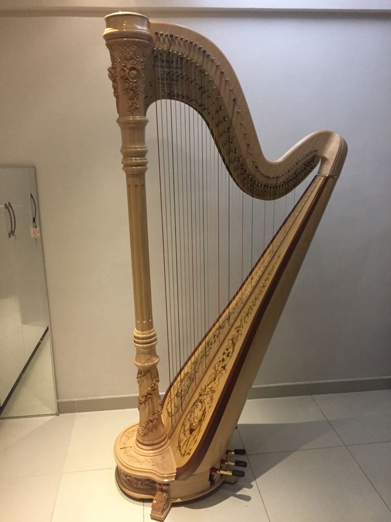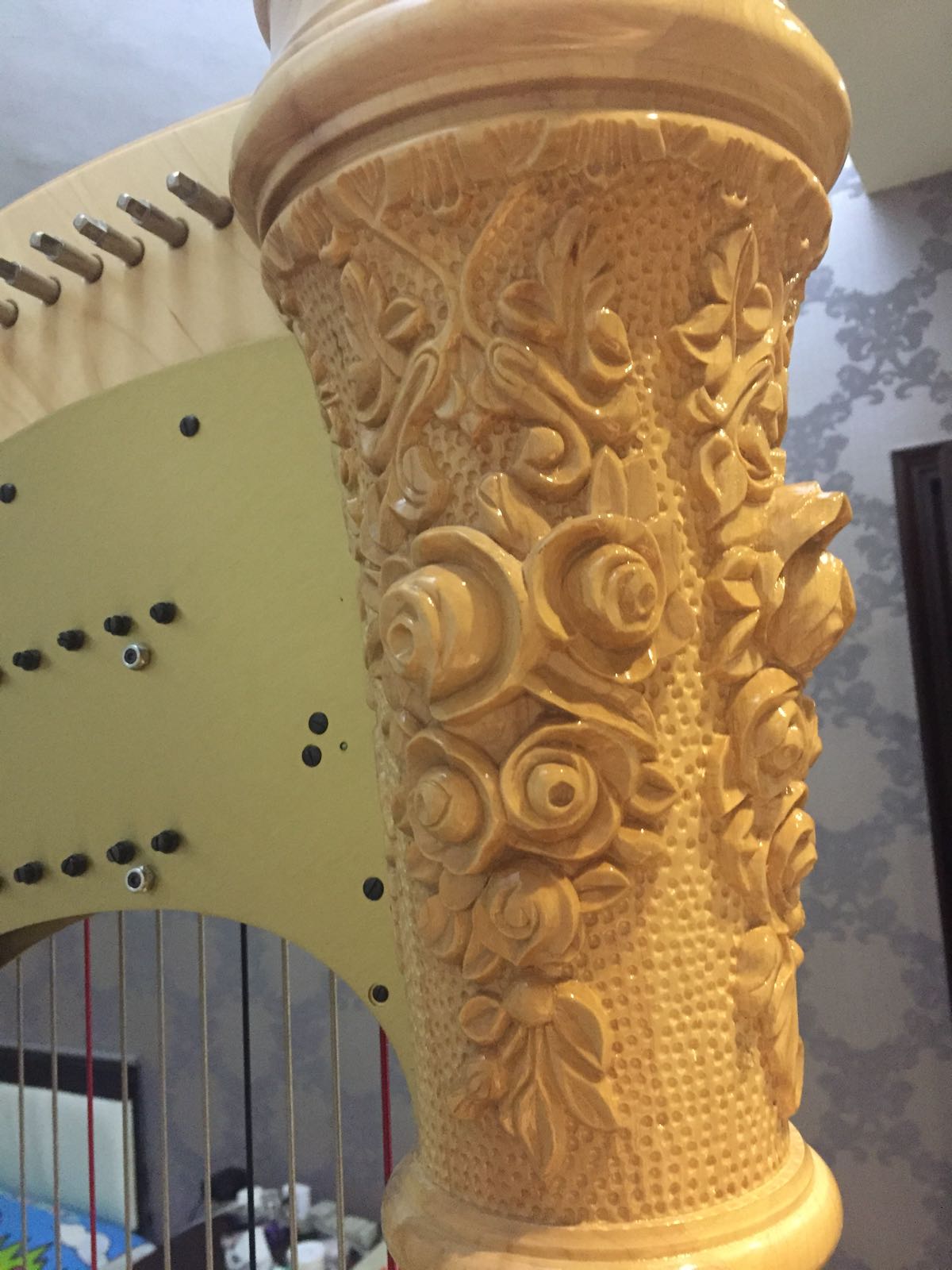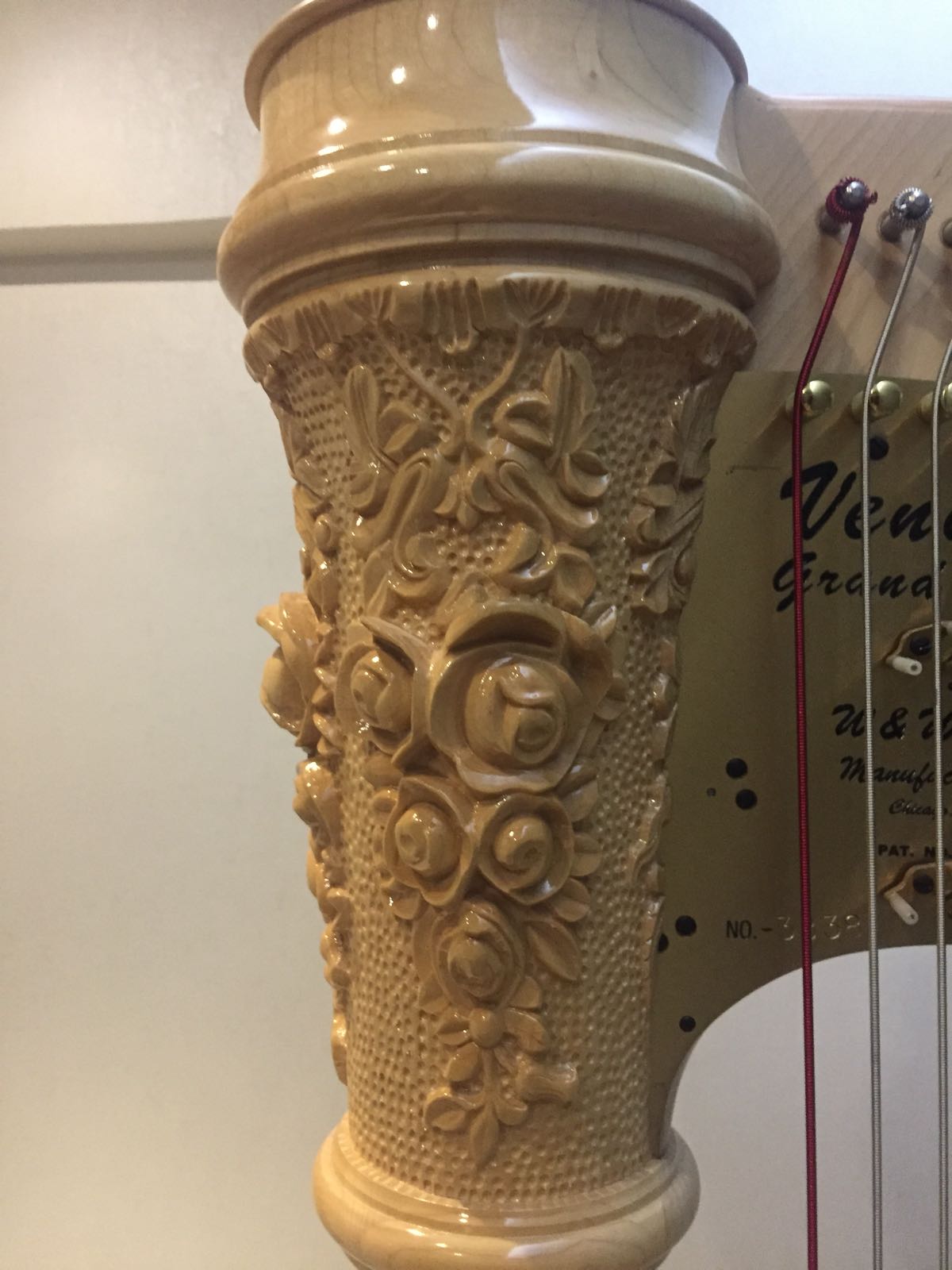 Cascading hand-carved roses adorn the column of this 47 string crowd pleaser. Good and Warm tone!